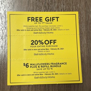 Bath & Body Works Coupon Booklet w/ Free Item Offer ... Bath & Body Works is sending out coupons again!. Watch your snail mail as you may receive a new Bath & Body Works flyer! Inside is a coupon to score a FREE Gift (up to $7.50) with any purchase, plus a second coupon valid for 20% off your entire purchase!