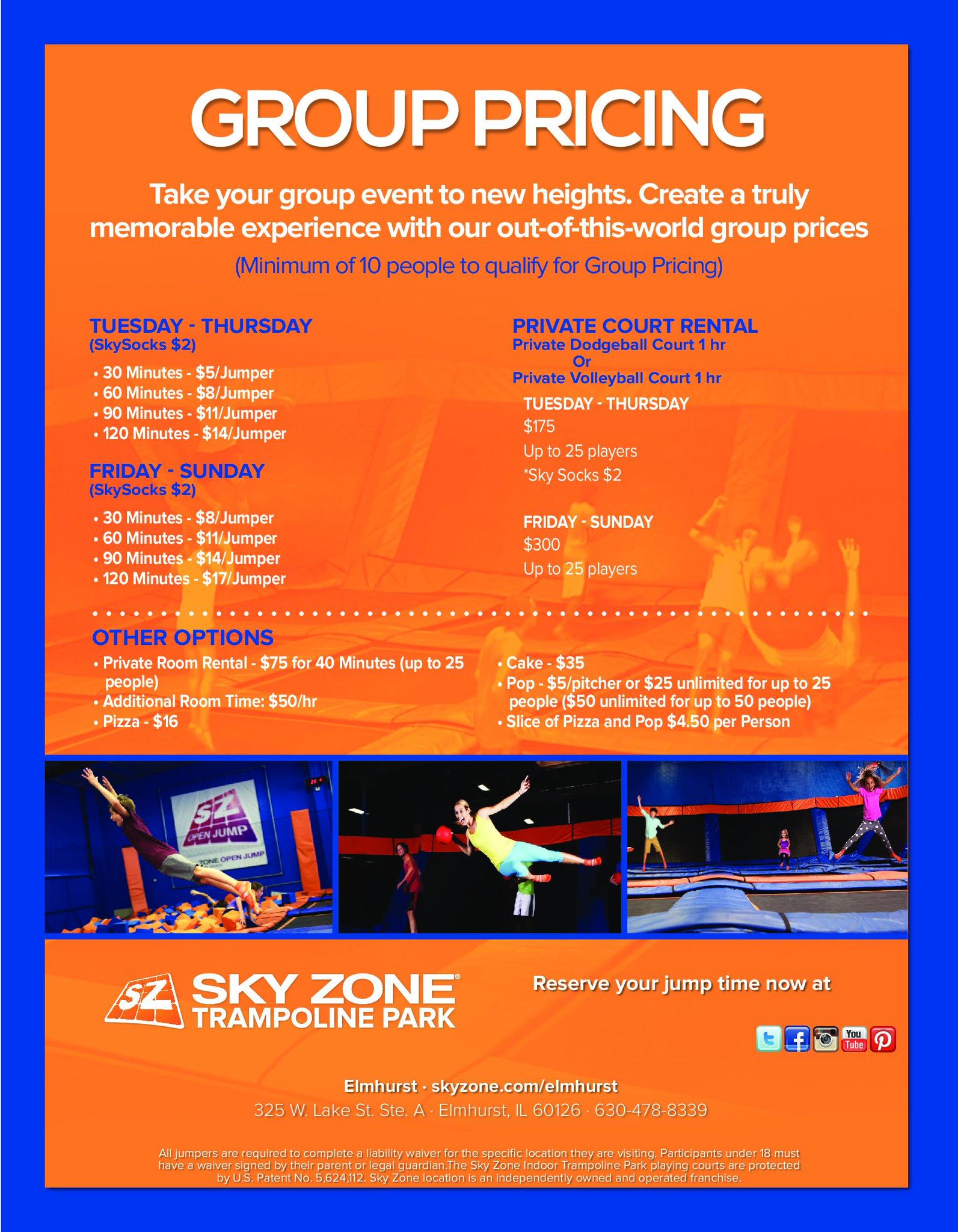 SKY ZONE TRAMPOLINE PARK - 90 Photos & 111 Reviews - Yelp Specialties: Sky Zone Elmhurst is the original indoor trampoline park, and we never stop searching for new ways play. We're firm believers in the power of active play. The kind of play that makes us jump, dodge, flip, sweat, bounce, and laugh. Play where you can be you, in the moment, free. The kind of play that is good for our bodies and even better for our brains. Our vision is a world where ...